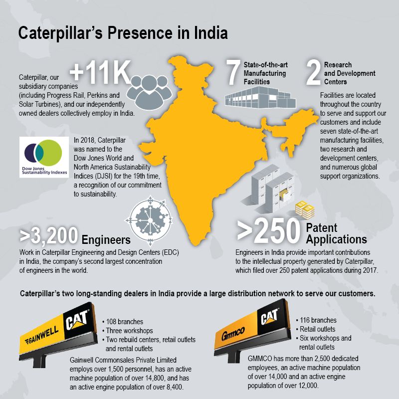 Caterpillar has been a key partner in India’s growth since the first sales of a Caterpillar track-type tractor in 1914, supporting growth in agriculture, mining, transportation, captive power generation and construction of infrastructure. Today, Caterpillar and its dealers collectively employ more than 11,000+ people in India, representing nearly every part of Caterpillar’s business.