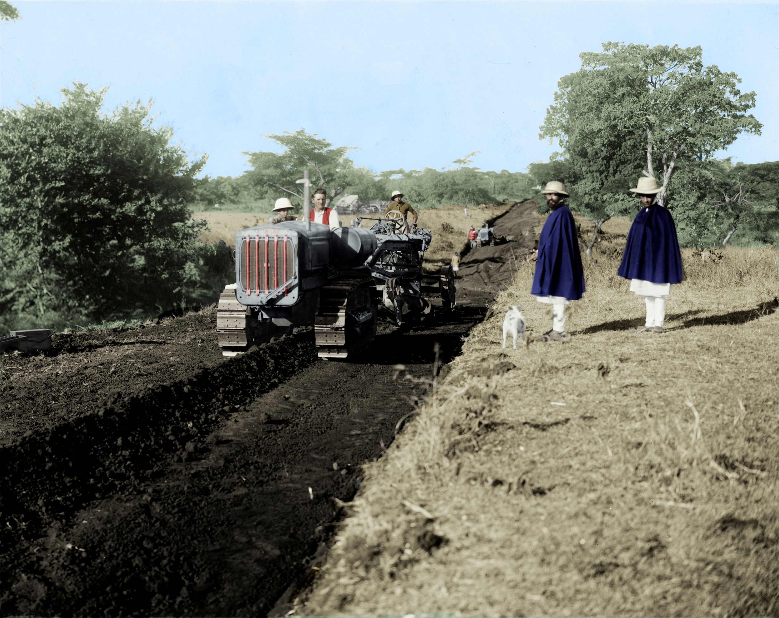 In 1932 the Emperor took a personal interest in the progress of what would become Ethiopia’s longest road. Accompanied by his two sons, Selassie visited the town of Wolisso, which is 110 kilometers from Addis Ababa. There they viewed the construction work on the Jhimma Road. Seen in this colorized photo, his Majesty (1st from the bank) and his son the crown prince are watching the work of a Caterpillar Thirty tractor and grader. Prince Luel Makannen is driving the Caterpillar Thirty.