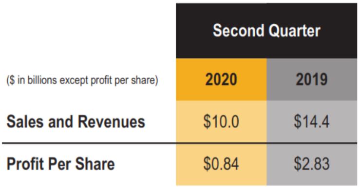 DEERFIELD, Ill. – Caterpillar Inc. (NYSE: CAT) today announced second-quarter 2020 sales and revenues of $10.0 billion, a 31% decrease compared with $14.4 billion in the second quarter of 2019. The decline was due to lower sales volume driven by lower end-user demand and the impact from changes in dealer inventories. Dealers decreased machine and engine inventories about $1.4 billion during the second quarter of 2020, compared with an increase of about $500 million during the second quarter of 2019.