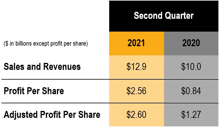DEERFIELD, Ill. – Caterpillar Inc. (NYSE: CAT) today announced second-quarter 2021 sales and revenues of $12.9 billion, a 29% increase compared with $10.0 billion in the second quarter of 2020. The increase was primarily due to higher sales volume driven by higher end-user demand for equipment and services and the impact from changes in dealer inventories. Dealers decreased their inventories more during the second quarter of 2020 than during the second quarter of 2021.