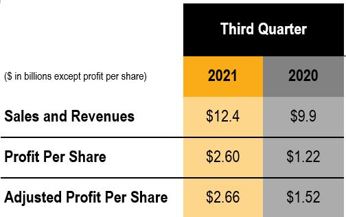 “Our global team continues to execute our long-term strategy for profitable growth while working to mitigate supply chain challenges as we serve our customers,” said Chairman and CEO Jim Umpleby. “Our third-quarter results reflect higher sales and revenues across our three primary segments and in all regions.”