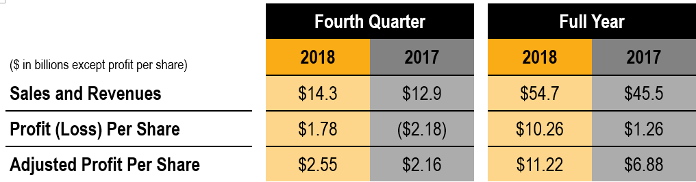 Sales and revenues in the fourth quarter of 2018 were $14.3 billion, compared with $12.9 billion in the fourth quarter of 2017, an 11 percent increase. Fourth-quarter 2018 profit was $1.78 per share, compared with a loss of $2.18 per share in the fourth quarter of 2017. Adjusted profit per share in the fourth quarter of 2018 was $2.55, compared with fourth-quarter 2017 adjusted profit per share of $2.16, up 18 percent.