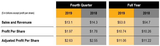 Sales and revenues for the fourth quarter of 2019 were $13.1 billion, an 8% decrease compared with $14.3 billion in the fourth quarter of 2018. Fourth-quarter 2019 profit per share was $1.97, compared with $1.78 profit per share in the fourth quarter of 2018. Adjusted profit per share in the fourth quarter of 2019 was $2.63, compared with fourth-quarter 2018 adjusted profit per share of $2.55.