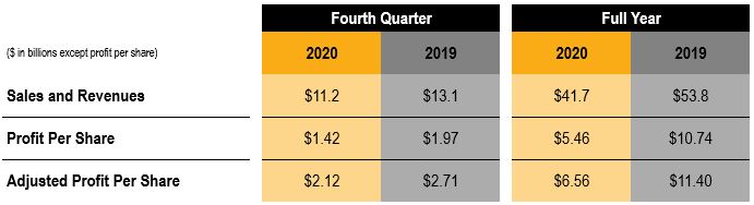 Full-year sales and revenues in 2020 were $41.7 billion, down 22% compared with $53.8 billion in 2019. The sales decline reflected lower end-user demand and dealers reducing their inventories by $2.9 billion in 2020. Operating profit margin was 10.9% for 2020, compared with 15.4% for 2019. Full-year profit was $5.46 per share in 2020, compared with profit of $10.74 per share in 2019. Adjusted profit per share in 2020 was $6.56, compared with adjusted profit per share of $11.40 in 2019.