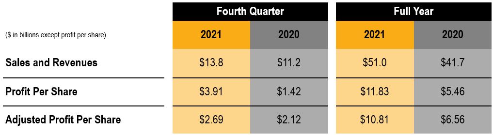 Full-year sales and revenues in 2021 were $51.0 billion, up 22% compared with $41.7 billion in 2020. The increase reflected higher end-user demand for equipment and services and the impact from changes in dealer inventories. Dealers decreased their inventories $2.9 billion in 2020, while remaining about flat in 2021. Operating profit margin was 13.5% for 2021, compared with 10.9% for 2020. Full-year profit was $11.83 per share in 2021, compared with profit of $5.46 per share in 2020. Adjusted profit per share in 2021 was $10.81, compared with adjusted profit per share of $6.56 in 2020.