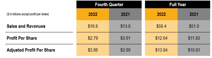 Full-year sales and revenues in 2022 were $59.4 billion, up 17% compared with $51.0 billion in 2021. The increase reflected favorable price realization and higher sales volume, driven by the impact from changes in dealer inventories, increased services and higher sales of equipment to end users. Dealers increased their inventories $2.4 billion in 2022, while remaining about flat in 2021. Full-year profit was $12.64 per share in 2022, compared with profit of $11.83 per share in 2021. Adjusted profit per share in 2022 was $13.84, compared with adjusted profit per share of $10.81 in 2021.
