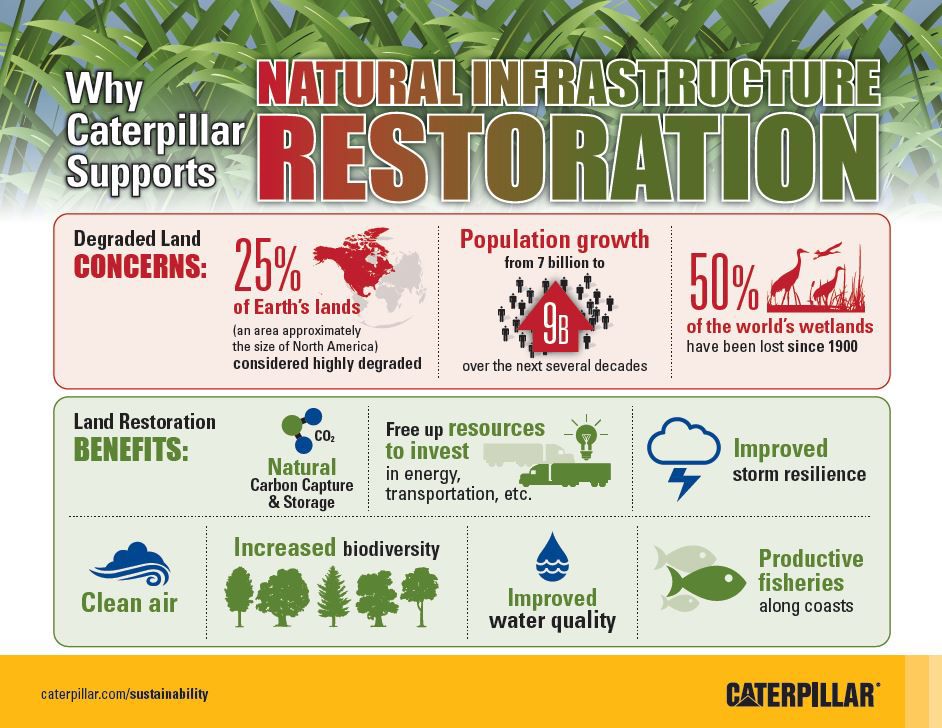 Caterpillar will convene leaders from the engineering, construction and financial sectors, as well as thought leaders from academia, non-government organizations and government officials to engage in a discussion on the need for and the benefits of restoring degraded natural infrastructure – such as forests, prairies, agricultural lands, estuaries, coastal landscapes and wetlands – as well as the opportunities it offers with respect to the global sustainable development goals. The outcomes from the dialogue will drive significant recommendations for both the public and private sectors.