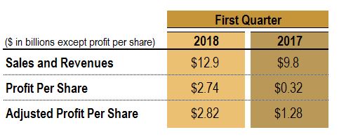 DEERFIELD, Ill. — Caterpillar Inc. (NYSE: CAT) today announced first-quarter 2018 sales and revenues of $12.9 billion, compared with $9.8 billion in the first quarter of 2017. First-quarter 2018 profit of $2.74 per share was a first-quarter record. Profit was $0.32 per share in the first quarter of 2017. Adjusted profit per share in the first quarter of 2018 was $2.82, compared with first-quarter 2017 adjusted profit per share of $1.28.