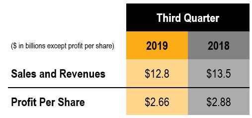 DEERFIELD, Ill. – Caterpillar Inc. (NYSE: CAT) today announced third-quarter 2019 sales and revenues of $12.8 billion, a 6% decrease compared with $13.5 billion in the third quarter of 2018. Third-quarter 2019 profit per share was $2.66, compared with $2.88 profit per share in the third quarter of 2018.