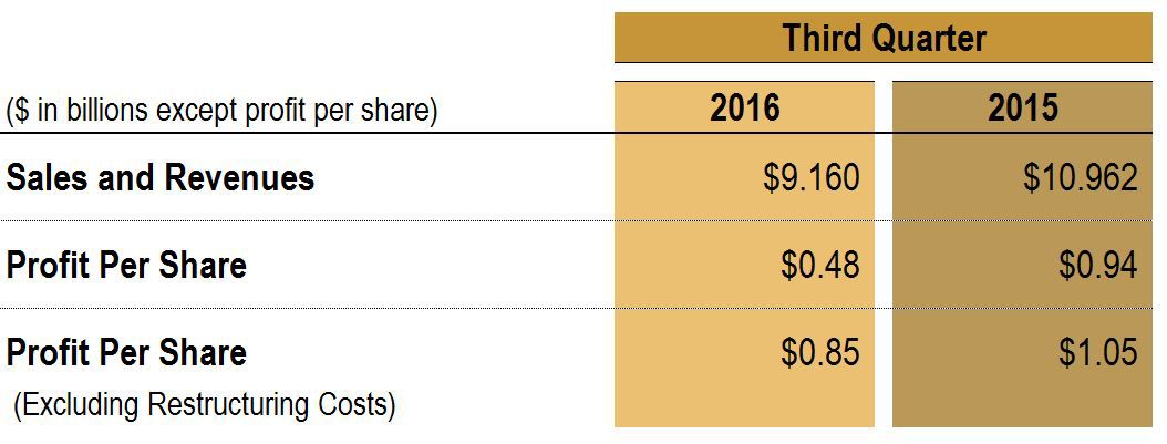 PEORIA, Ill. — Caterpillar Inc. (NYSE: CAT) today announced profit per share of $0.48 for the third quarter of 2016, a decrease from $0.94 per share in the third quarter of 2015. Excluding restructuring costs, profit per share was $0.85, down from $1.05 per share in the third quarter of 2015. Third-quarter 2016 sales and revenues of $9.2 billion were down 16 percent from $11.0 billion in the third quarter of 2015.