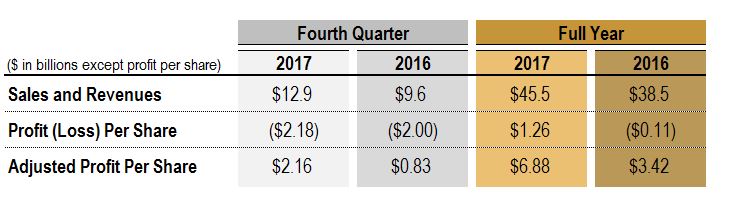 Full-year sales and revenues in 2017 were $45.5 billion, up about 18 percent from $38.5 billion in 2016. Full-year profit was $1.26 per share in 2017, compared with a loss of $0.11 per share in 2016.