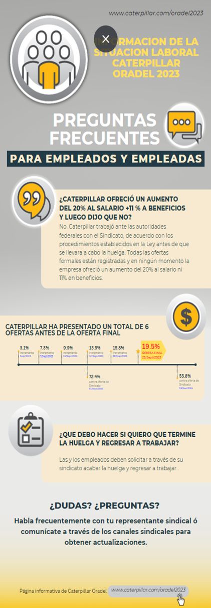 Entendemos que este ha sido un proceso largo que impacta a los miembros de nuestro equipo. Conforme nos acercamos a un año de negociaciones, Caterpillar espera que se pueda lograr una resolución y que los miembros del equipo puedan regresar a trabajar. Mantenemos el compromiso de continuar la comunicación con todas las personas involucradas.