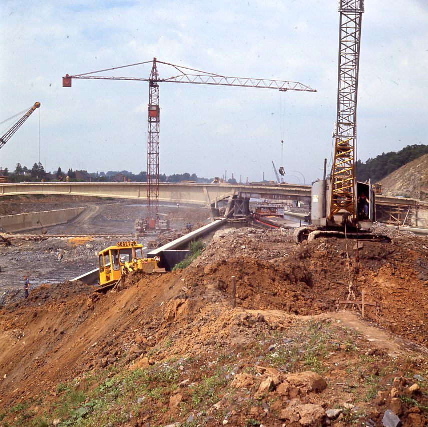 Tratores de esteira da Caterpillar e tratores-escrêiper de rodas trabalhando no Canal Charleroi.